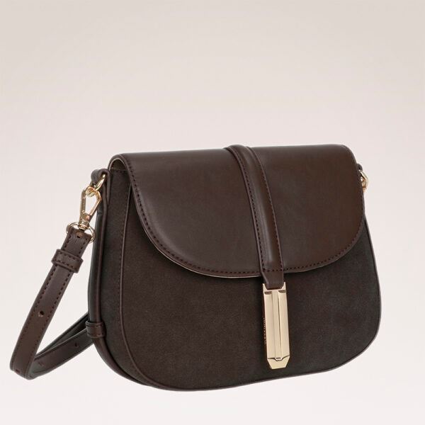 Denna eleganta sadelväska i konstläder har ett glänsande guldfärgat spänne.