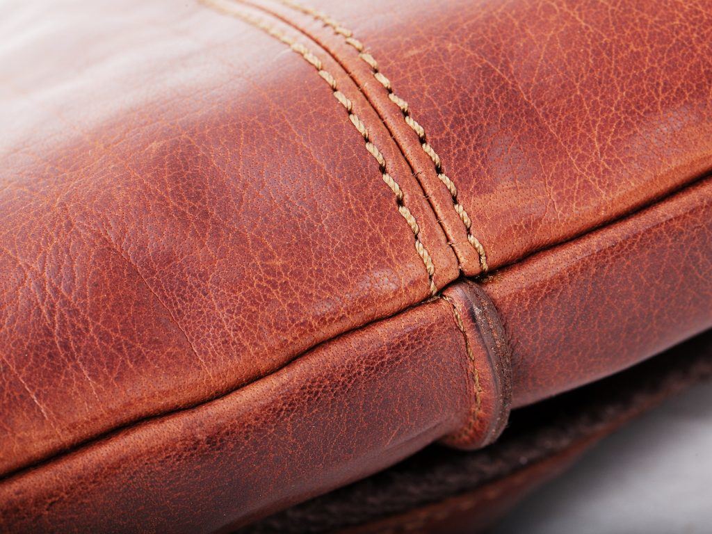 Väskan är handgjord i buffelskinn.